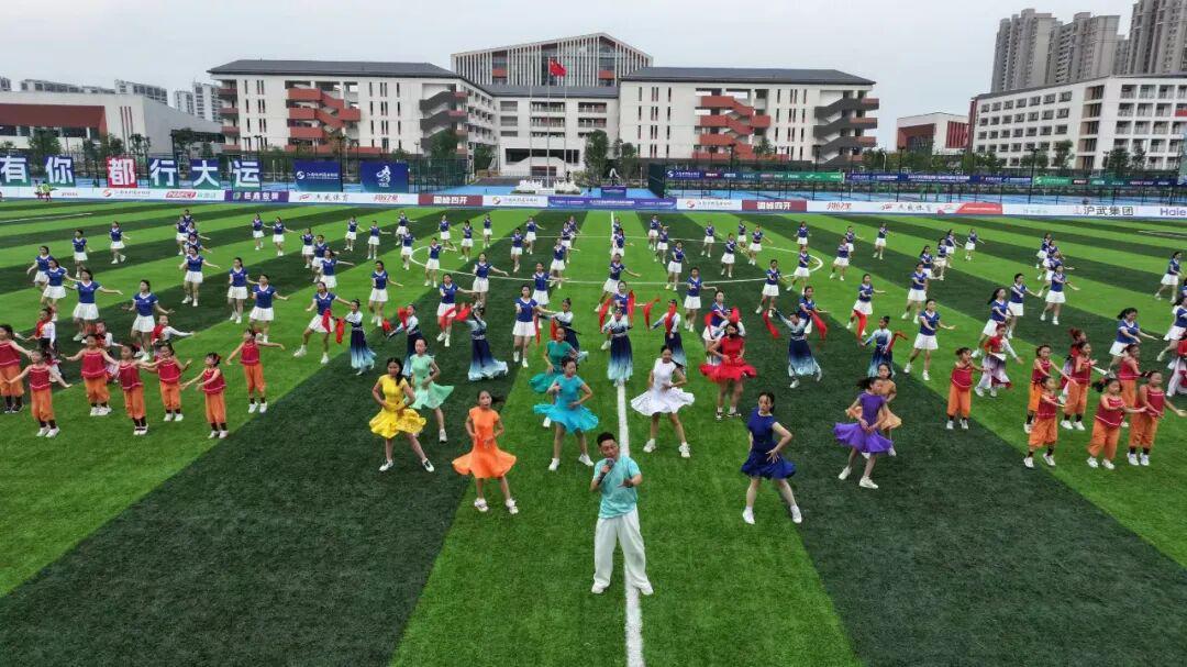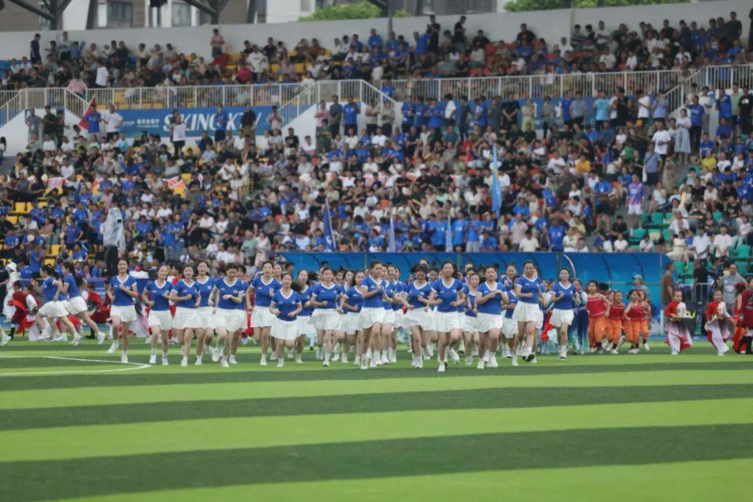上半场的激烈比赛告一段落,《一起来,更精彩》的旋律响彻球场。百余名职教集团学生身着靓丽服饰亮相绿茵场,歌手陶艺以激昂歌声唱响全民体育精神。